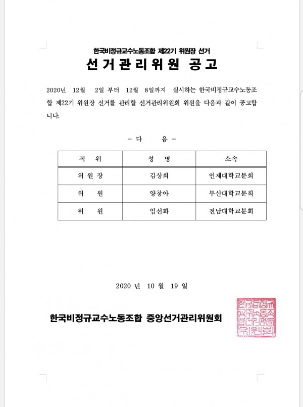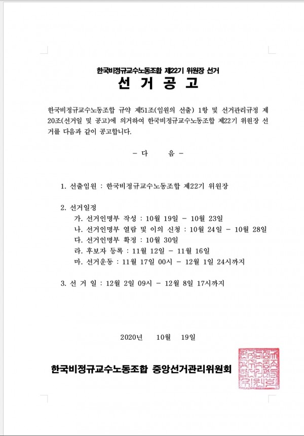 한국비정규교수노동조합 제22기 위원장 선거 페이지 정보 작성자 성균관대분회 작성일20-10-19 10:58 조회5,372회 댓글0건 이전글 다음글 목록 본문 한국비정규교수노동조합 제22기 위원장 선거 공고 댓글목록 등록된 댓글이 없습니다. 이전글 다음글 목록